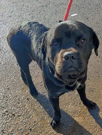 “Boog” is a male Rottweiler with a short black coat.