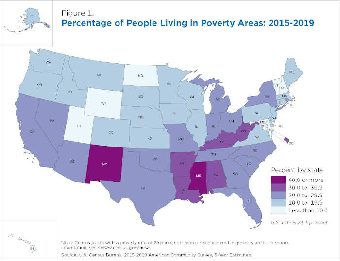 – 21.1% of the U.S. population lived in poverty areas, ranging from a low of 5.2% in New Hampshire to a high of 42.4% in Mississippi.