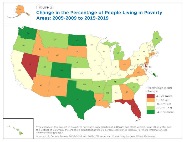 – The percentage of people living in poverty areas increased in 25 states and decreased in 23 states and the District of Columbia. The change was not statistically significant in two states.