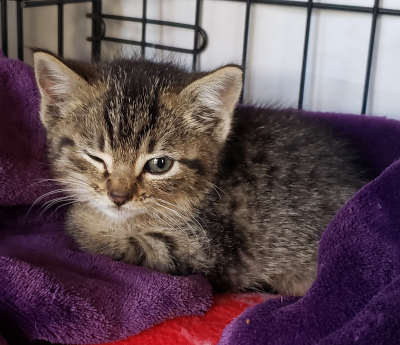 “Bam-Bam” is a male domestic medium hair kitten with a gray tabby and black coat and green eyes.