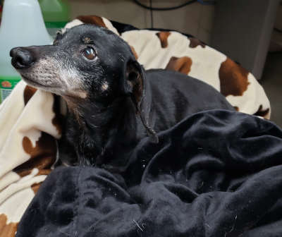 “Daisy” is a senior female dachshund with a short black and tan coat.