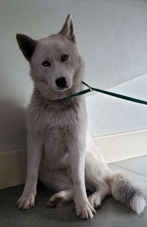“Amira” is a female husky mix with a medium-length black and white coat and blue eyes.
