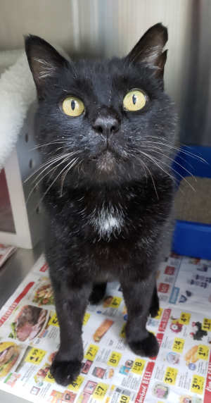 “Scamp” is a senior male domestic short hair cat with gold eyes.