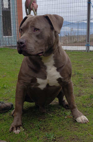 This male pit bull terrier has a short gray coat.