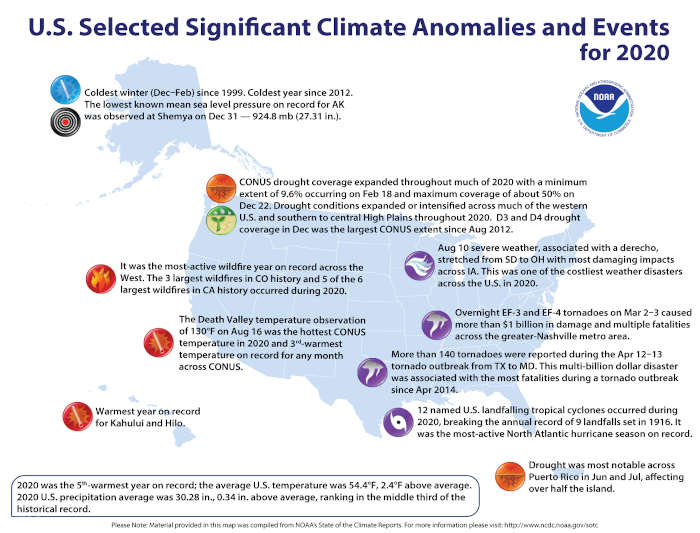 Here’s a recap of the climate and extreme weather events across the U.S.in 2020, according to scientists at NOAA’s National Centers for Environmental Information.