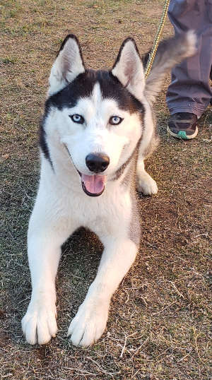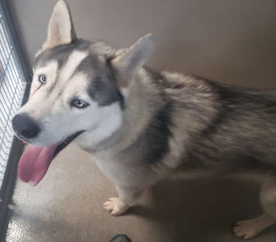 This male husky has a medium-length black and white blue eyes.