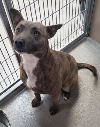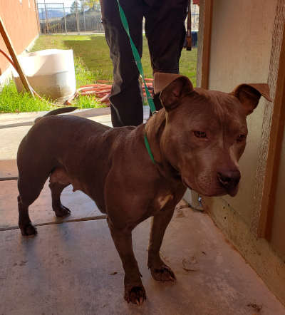 This female pit bull terrier has a short gray coat.