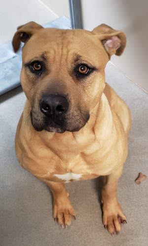 This young male mastiff has a short tan coat.
