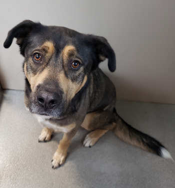 This male shepherd mix has a medium-length tricolor coat.