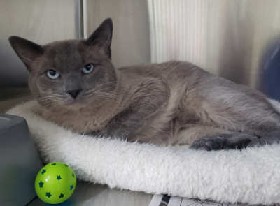 “Loki” is a female domestic short hair with a seal point and gray coat and blue eyes.