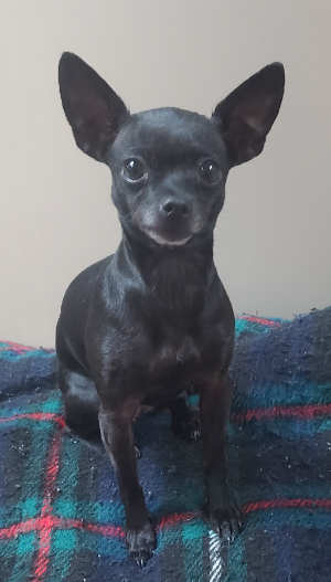 This female Chihuahua has a short black coat.