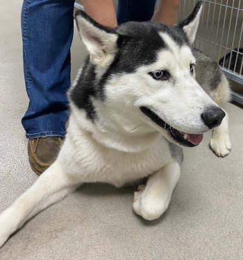 This male husky has a medium-length black and white coat and blue eyes.