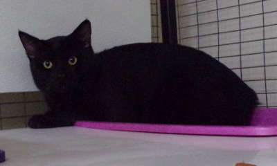 “Coconut” is a male domestic medium hair kitten with a black coat.