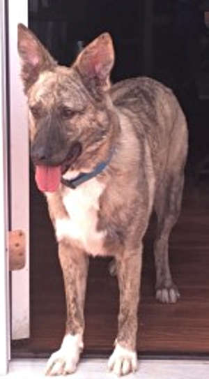 “Jax” is a male German Shepherd mix with a medium-length brindle and white coat.