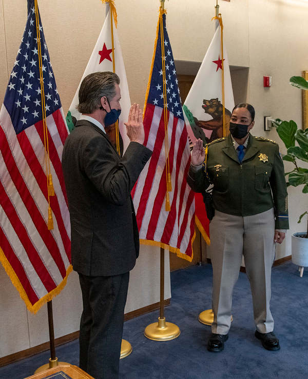 Gov. Gavin Newsom on Tuesday administered the oath of office to California Highway Patrol Commissioner Amanda Ray, a historic move making her the first woman in its 91-year history to lead the largest state law enforcement agency in the nation.