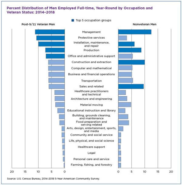 Top occupation groups for men, whether they were post-9/11 veterans or nonveterans, were: management; installation, maintenance, and repair; and production.