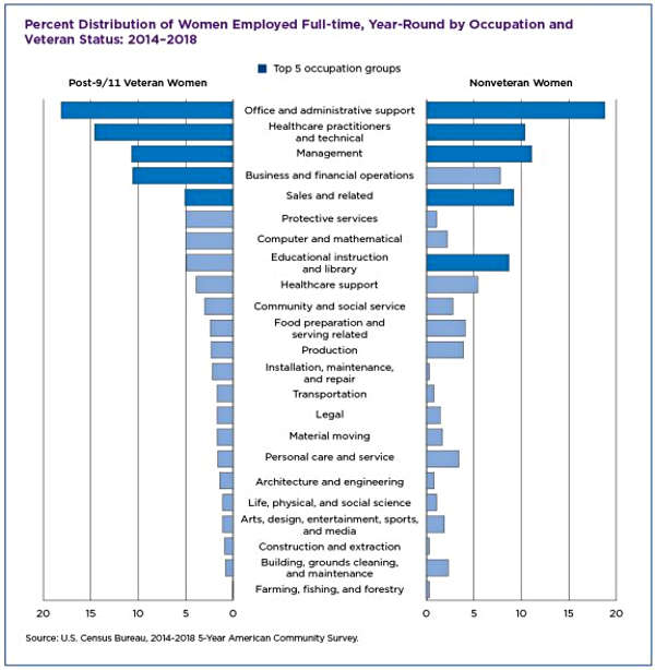 The pattern was similar among women. Post-9/11 veteran and nonveteran women also shared four of the same top occupation groups: office and administrative support, health care practitioners and technical, management, and sales and related.