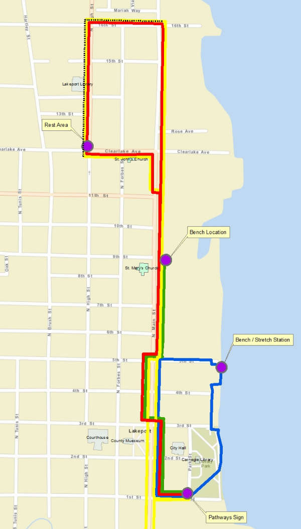 Grider said Blue was the driving force for designating the walking path, which extends from Martin Street at the south end of town to 16th Street to the north. It follows Main Street, looping around Library Park and then follows another loop that includes N. High Street and Clearlake Avenue.