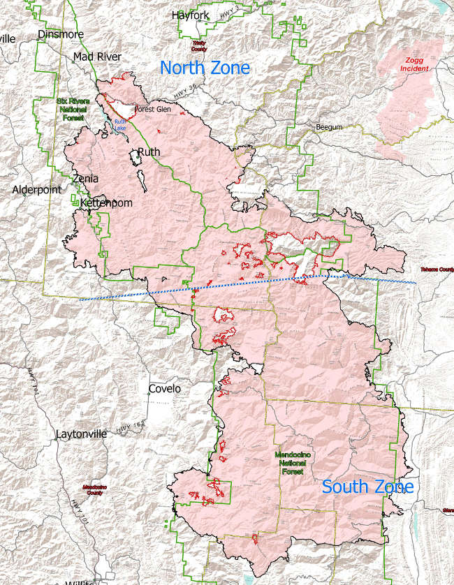 It began on Aug. 16 and 17 due to lightning. It’s burning on the Mendocino, Six Rivers and Shasta-Trinity National Forests.