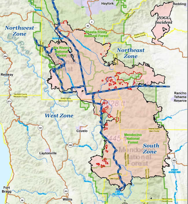The South Zone includes areas in northern Lake County, primarily Mendocino National Forest lands.