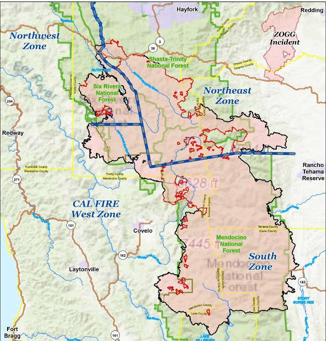 On the complex’s South Zone, the Forest Service said the Southwest Area Incident Management Team 1 continues to coordinate with Cal Fire Team 5 on control measures in the Middle Fork of the Eel River area, northeast of Covelo. Firefighters are constructing dozer line and handline in this area of the Mendocino National Forest to help protect local communities.