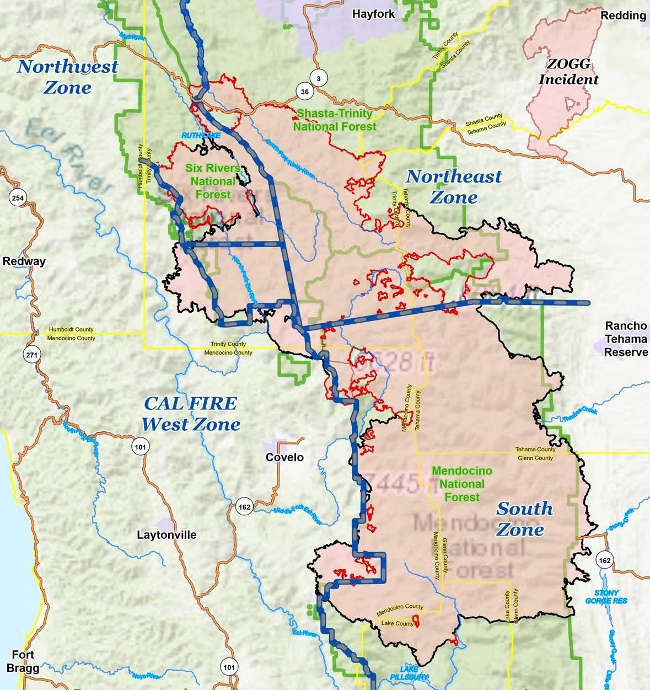 On the west side of the South Zone, fire continues to back out of the Yolla Bolly-Middle Eel Wilderness onto Cal Fire Direct Protection Area. The Southwest Area Incident Management Team is engaged in a coordinated and collaborative response with Cal Fire to support suppression actions to protect local communities at risk, officials said.
