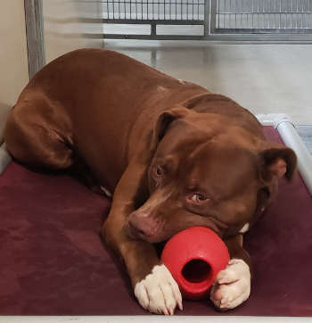 This male pit bull has a short brown coat.