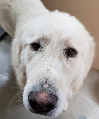 This male Great Pyrenees has a long white coat.