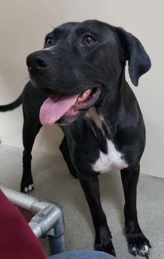 This female Labrador Retriever has a short black coat with white markings.