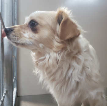 This male Papillon-Chihuahua mix has a medium-length tan and white coat.