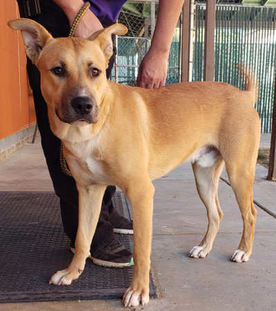 This young male German Shepherd Dog-Labrador Retriever mix has a short tan coat.