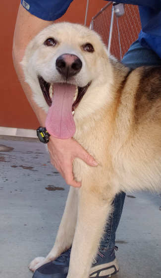 This young male husky-German Shepherd Dog has a medium-length cream and black coat.