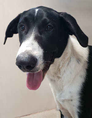 This young male border collie has a short black and white coat.