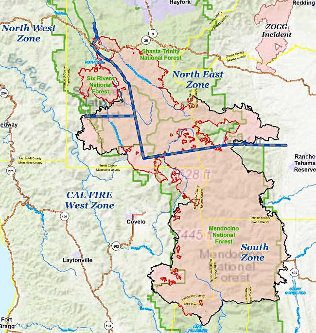 Sparked by lightning on Aug. 17, the complex is burning on the Mendocino, Shasta-Trinity and Six Rivers National Forests, lands that are located in Colusa, Glenn, Humboldt, Lake, Mendocino, Tehama and Trinity counties.
