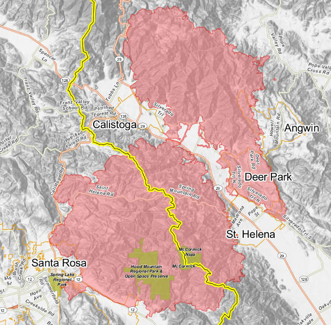 The Lake County Sheriff’s Office issued the evacuation warnings just after 3 p.m. for areas south of Rancheria Rancheria Road, east of the Lake-Sonoma County Line, north of the Lake-Napa County Line and west of Highway 29, and for South Mirable Road, east of Highway 29, north of the Lake-Napa County line and west of McGuire and Three Peaks ridgeline.