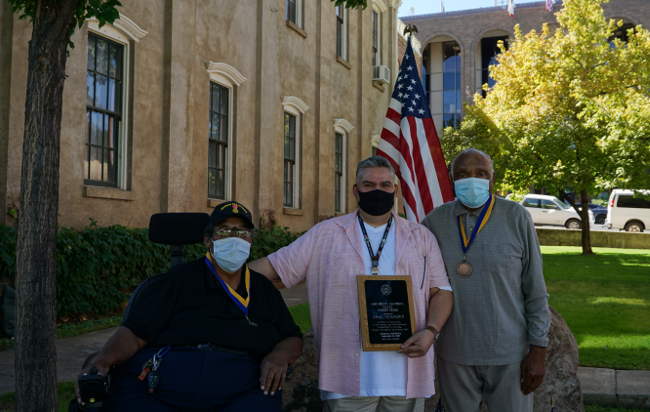 From left, Lake County NAACP Chapter President Rick Mayo, Lake County Veterans Services Officer Saul Sanabria and NAACP Veterans Affairs Committee Chairman Kenneth Bagsby following a ceremony in which Sanabria received the inaugural Veterans Patriot Award from the NAACP chapter on Thursday, September 24, 2020, in Lakeport, California. Photo by Elizabeth Larson/Lake County News. LAKEPORT, Calif. – On Thursday afternoon, the Lake County Chapter of the National Association for the Advancement of Colored People presented its inaugural Veterans Patriot Award to a man who the group said works tirelessly to look out for the well-being of veterans.