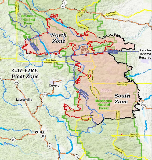 In the Yolla Bolly-Middle Eel Wilderness along Wrights Ridge, the August Complex North and South Zones continue to merge, therefore it is not safe to put firefighters in the area, officials reported.