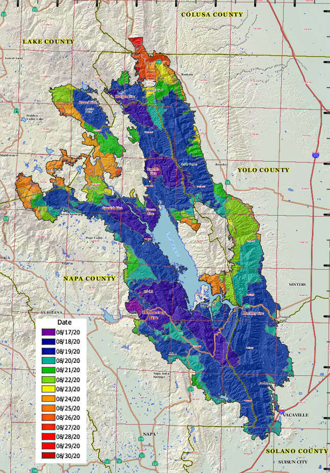 A progression map of the Hennessey fire portion of the LNU Lightning Complex in Northern California, courtesy of Cal Fire. The legend shows the dates that specific areas burned.