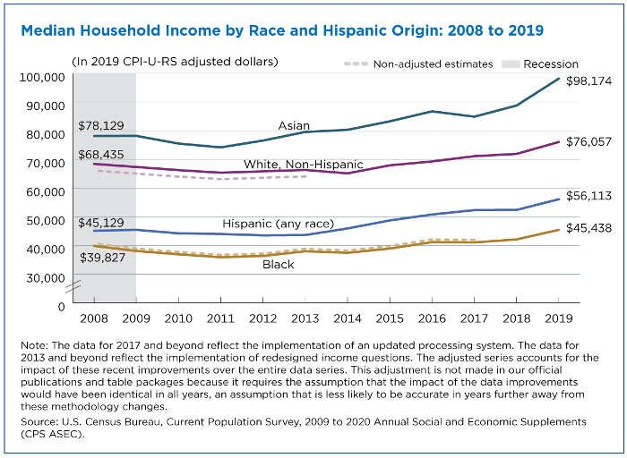 In 2019, median household income for Black households was $45,438 compared to $56,113 for Hispanic households, $76,057 for non-Hispanic White households, and $98,174 for Asian households.