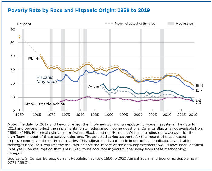 The historically low poverty rates for Blacks and Hispanics in 2019 reflect gains for race and Hispanic origin groups that have traditionally been disadvantaged compared to other groups over time.