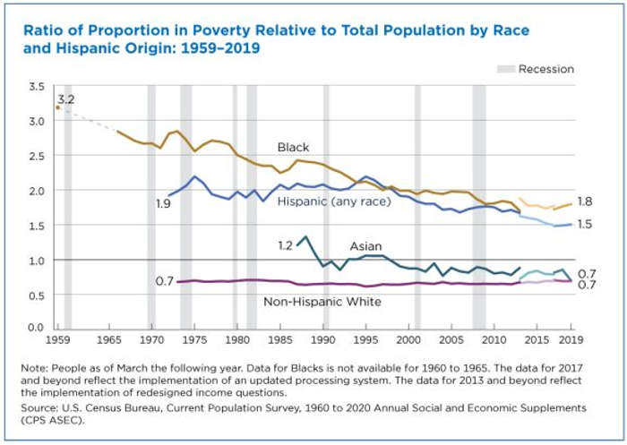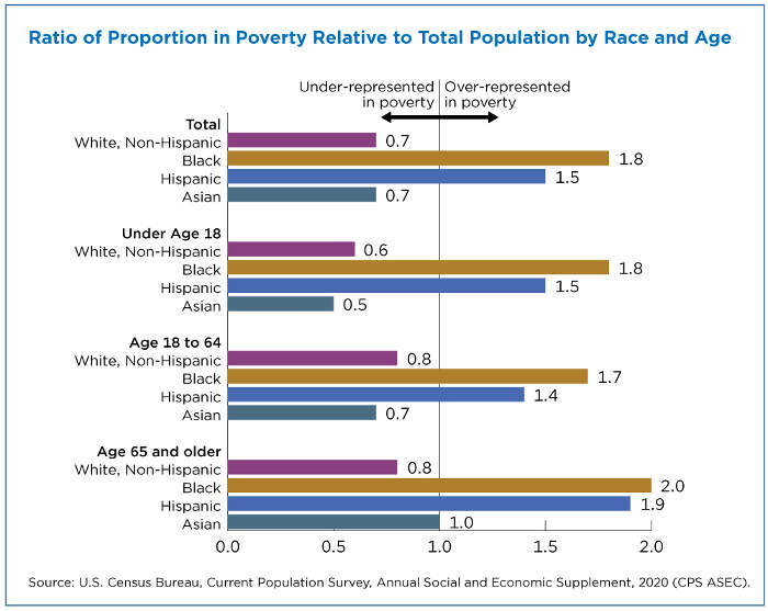 The figure below shows the ratio of people in poverty by race or Hispanic origin group to each group’s share of the total population.