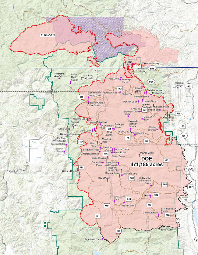 The Forest Service said the lightning-caused complex – burning for three weeks across the Mendocino National Forest – has burned 471,185 acres, with containment unchanged at 24 percent.