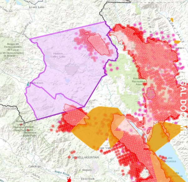 The Guenoc Valley development site lies inside the purple evacuation zone on this map for the LNU Lightning Complex from the county of Lake California in August 2020. Evacuations due to the complex were later lifted.