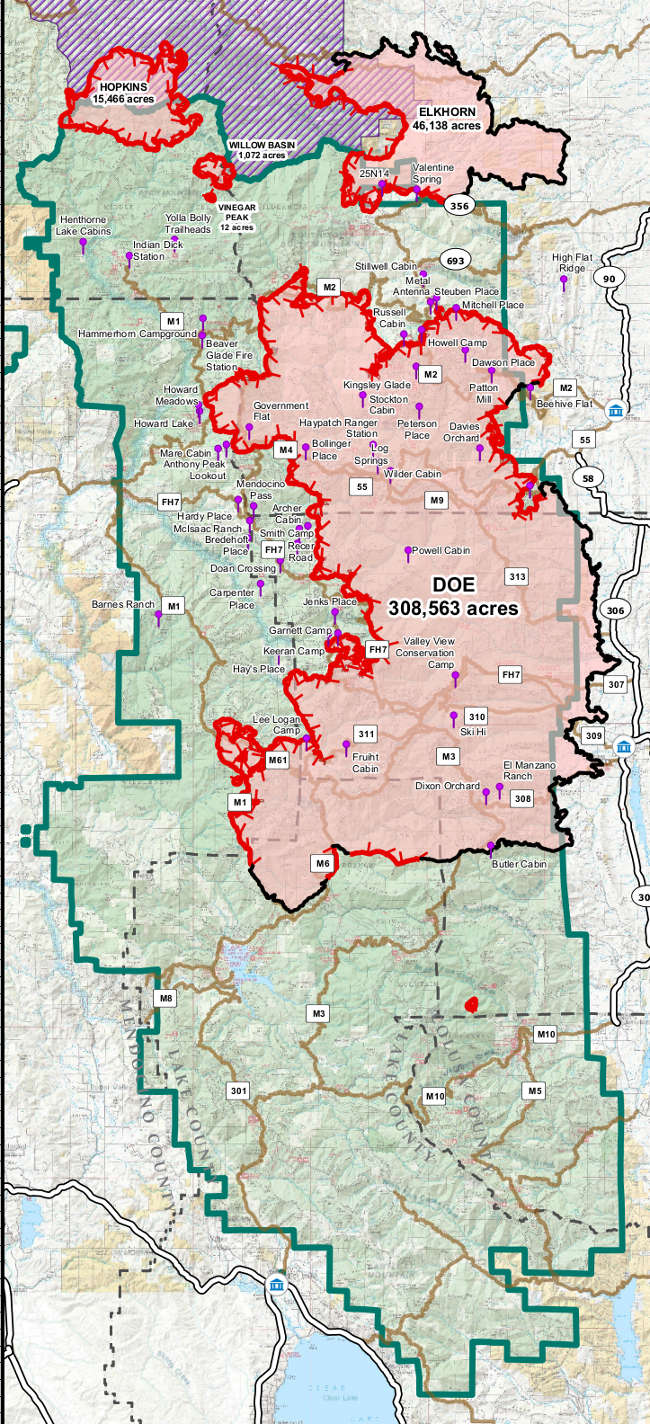 The burnout operations near Mendocino Pass to the west side of the Doe fire were successful and stayed within containment lines, officials said. Crews are also conducting burnout operations around the Mitchell Place on the north end of the Complex.