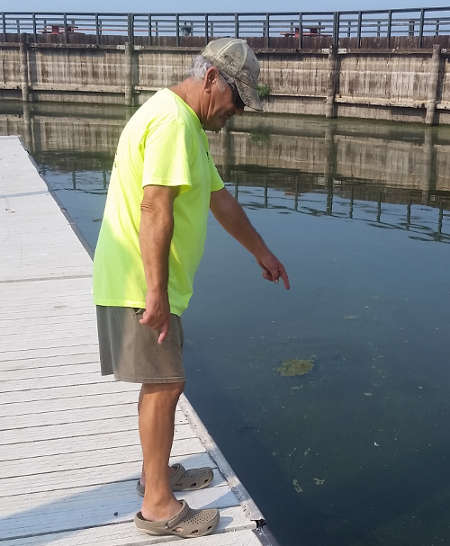Low water conditions at Lucerne Harbor Park in Lucerne, California, have brought sunken hazards closer to the surface creating obstacles to launch. Lucerne resident Robert Maher warns about a rock obstructing the left side boat dock at Lucerne Harbor Park. Photo by John Jensen/Lake County News. LAKE COUNTY, Calif. – Users of Clear Lake are advised to use extra caution when operating motorboats around shallow waters and near the shores of Clear Lake during the fall and winter months due to submerged debris near the lake’s surface.