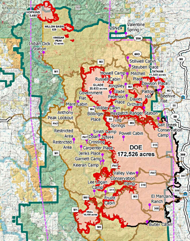 On the western border of the Doe fire, Wallacer said there is “really nasty, steep terrain” with a drainage that’s so steep and deep that hotshot crews said they can’t get into it. He said the area doesn’t have a lot probability of success for stopping the fire but it does have a high probability of getting someone hurt.