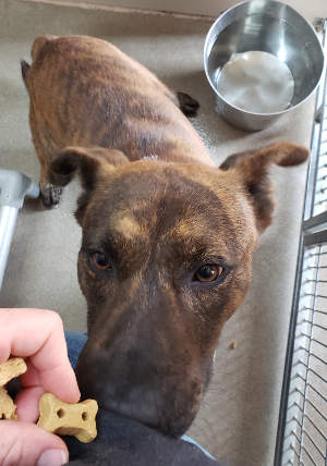 This male shepherd mix a medium-length brindle coat.