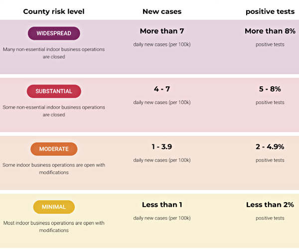 Daily case rates and test positivity rates determine tier placement. Businesses in counties in less-restrictive tiers can provide services in more ways.