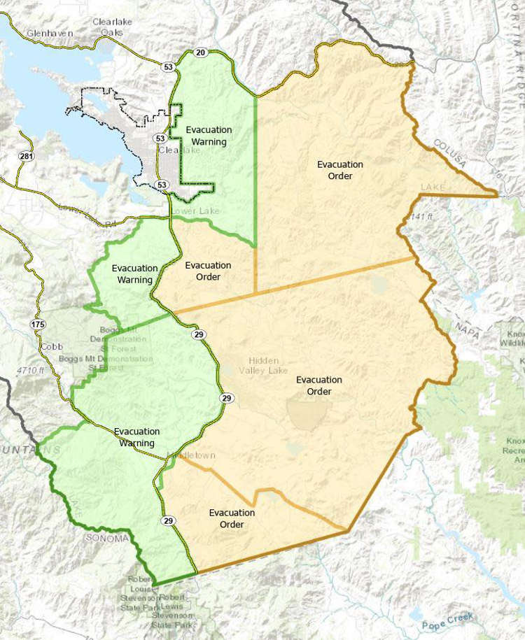 An evacuation order for the Hidden Valley Lake and Jerusalem Valley areas remains in effect, as does an evacuation warning for the greater Middletown area, including Middletown proper.