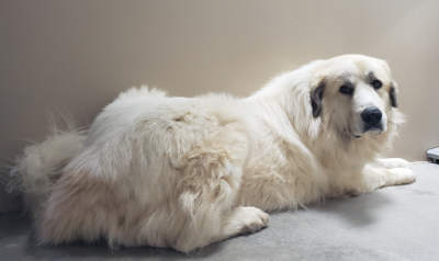 This male Great Pyrenees has a long cream-colored coat.